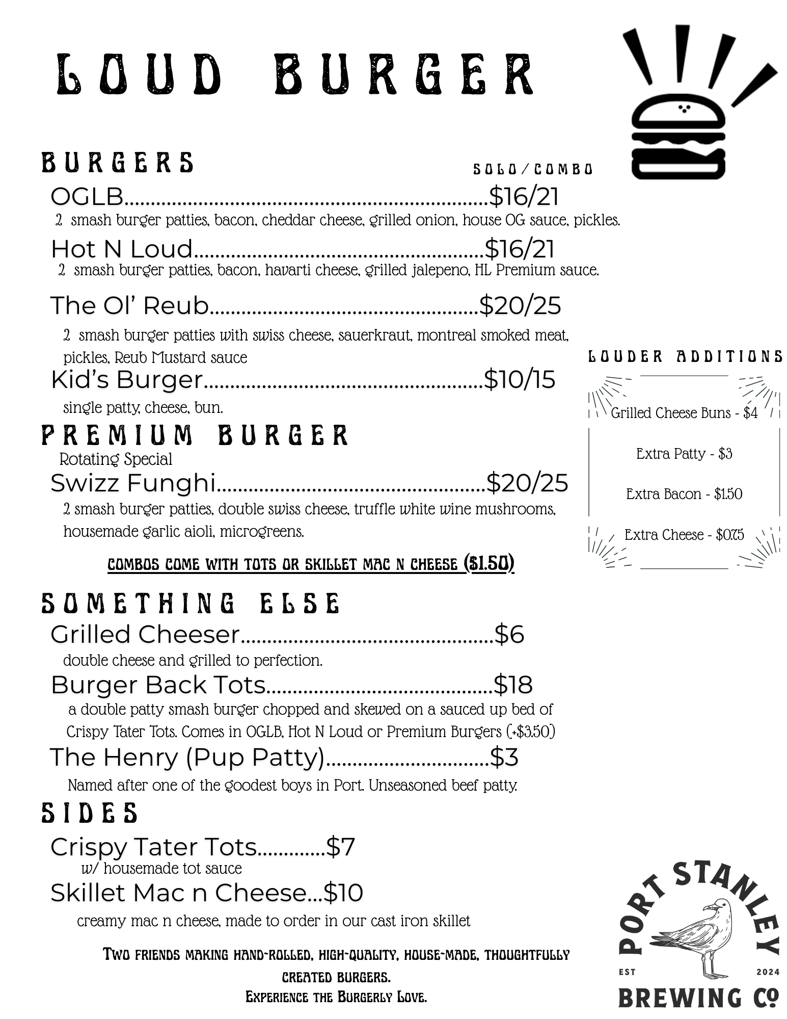 Founders – Loud BurgerFounders of Loud Burger, Matt and Qwertay built their following through pop-ups across Elgin County before bringing their smash burger concept to Port Stanley Brewing Co.